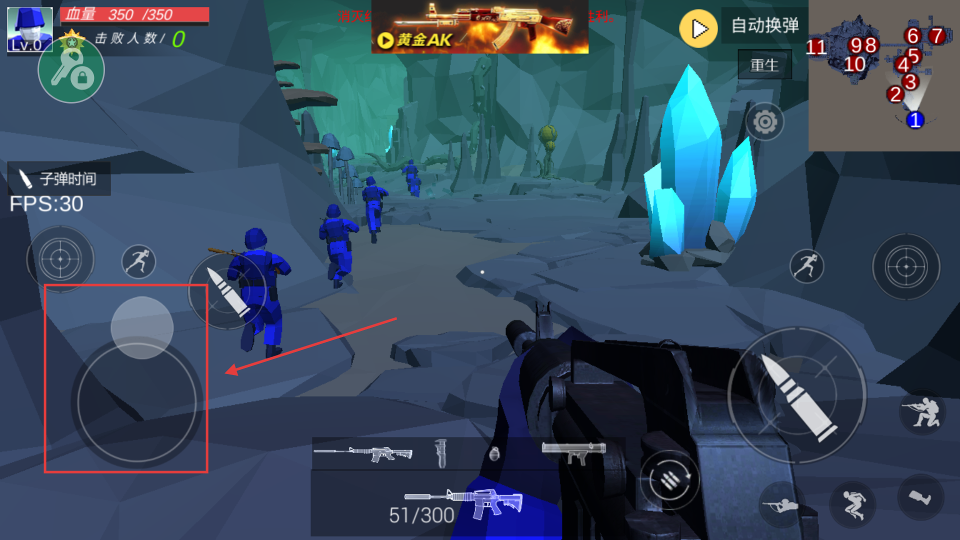 3、战斗时用左侧【移动轮盘】操控角色方向,灵活调整位置躲避敌人并寻找合适射击角度。