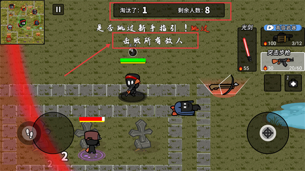 1、进入游戏后击败所有敌人是目标,可使用【光剑】-【突击步枪】等武器,关注淘汰与剩余人数提升战斗效率。
