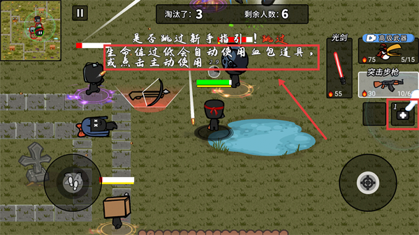 2、战斗中生命值过低时可自动或点击【血包】道具恢复,保持存活状态以便持续参与射击对抗。