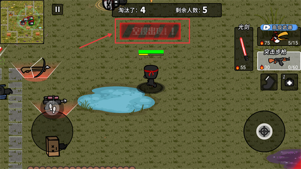 2、点击攻击按钮射击敌人,持续按住实现连发,移动到刷新武器旁点击捡起获取。