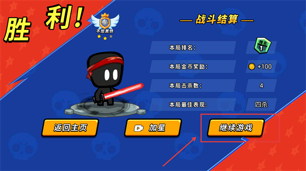 4、胜利后会显示排名金币奖励等结算信息,点击【继续游戏】可开启下一局挑战积累更多战绩。