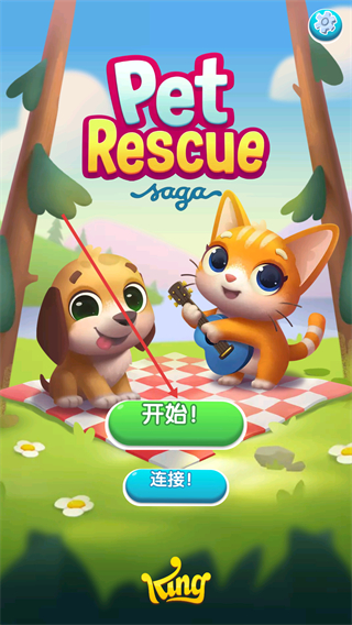 1、进入游戏主界面,点击【开始!】进入关卡,这是一款消除类救援游戏,核心目标是解救场景中的宠物角色。