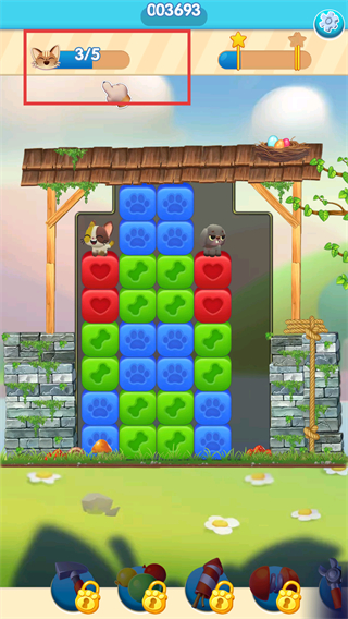 2、关卡目标为收集3/5的宠物,通过消除同色方块(蓝、绿、红)来推进宠物移动,优先消除宠物下方的方块。