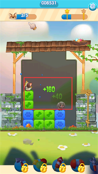3、消除方块后会获得积分(+160、+40),同时宠物会随方块消除向下移动,需持续消除路径上的方块推进救援。