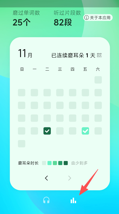 3、设有学习统计功能,点击统计按钮查看磨过单词数听过片段数,以及连续磨耳朵天数及时长,了解学习进度与坚持情况。