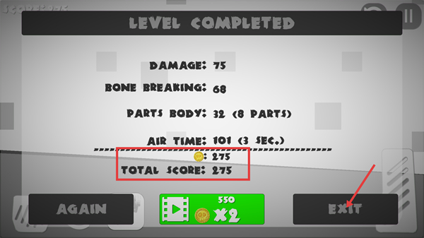 4、关卡完成后会显示【TOTAL-SCORE-275】等统计项,可选择【EXIT】退出关卡,或观看广告获取双倍奖励。