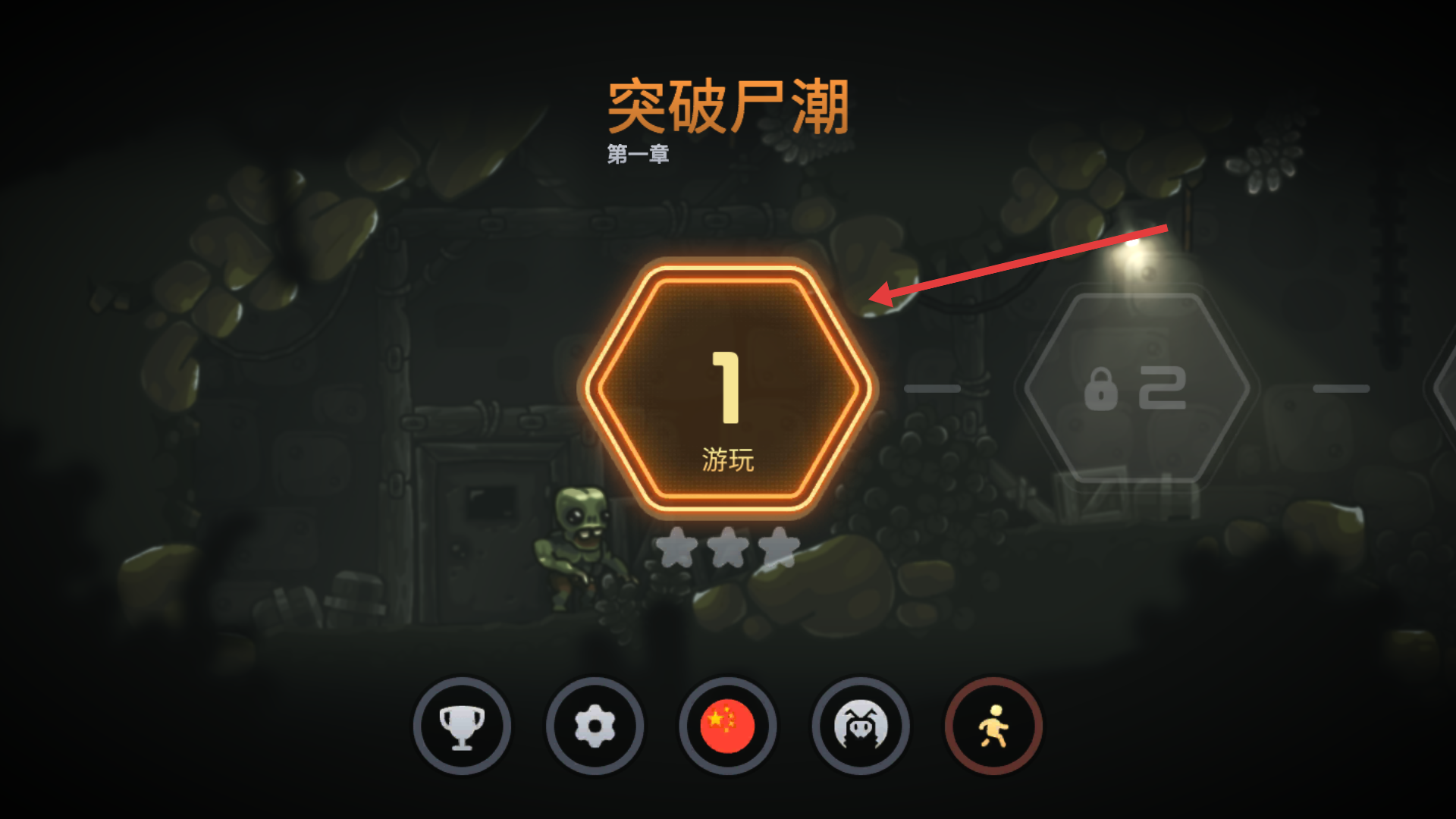 1、进入游戏后选择【突破尸潮-第一章】的【1游玩】按钮,开始第一关卡的生存挑战。