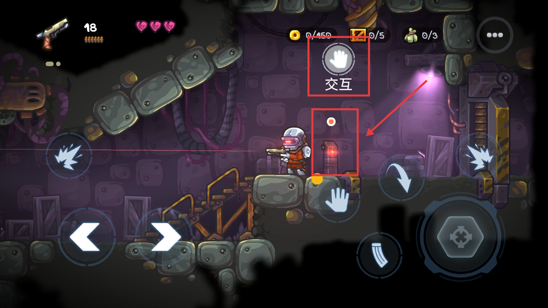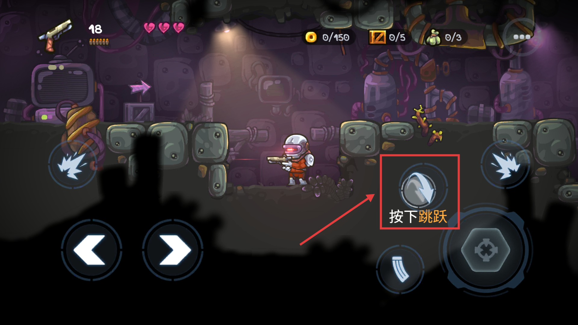 2、使用左侧摇杆控制角色移动,右侧【按下跳跃】按钮可躲避障碍,同时注意上方弹药和生命值。