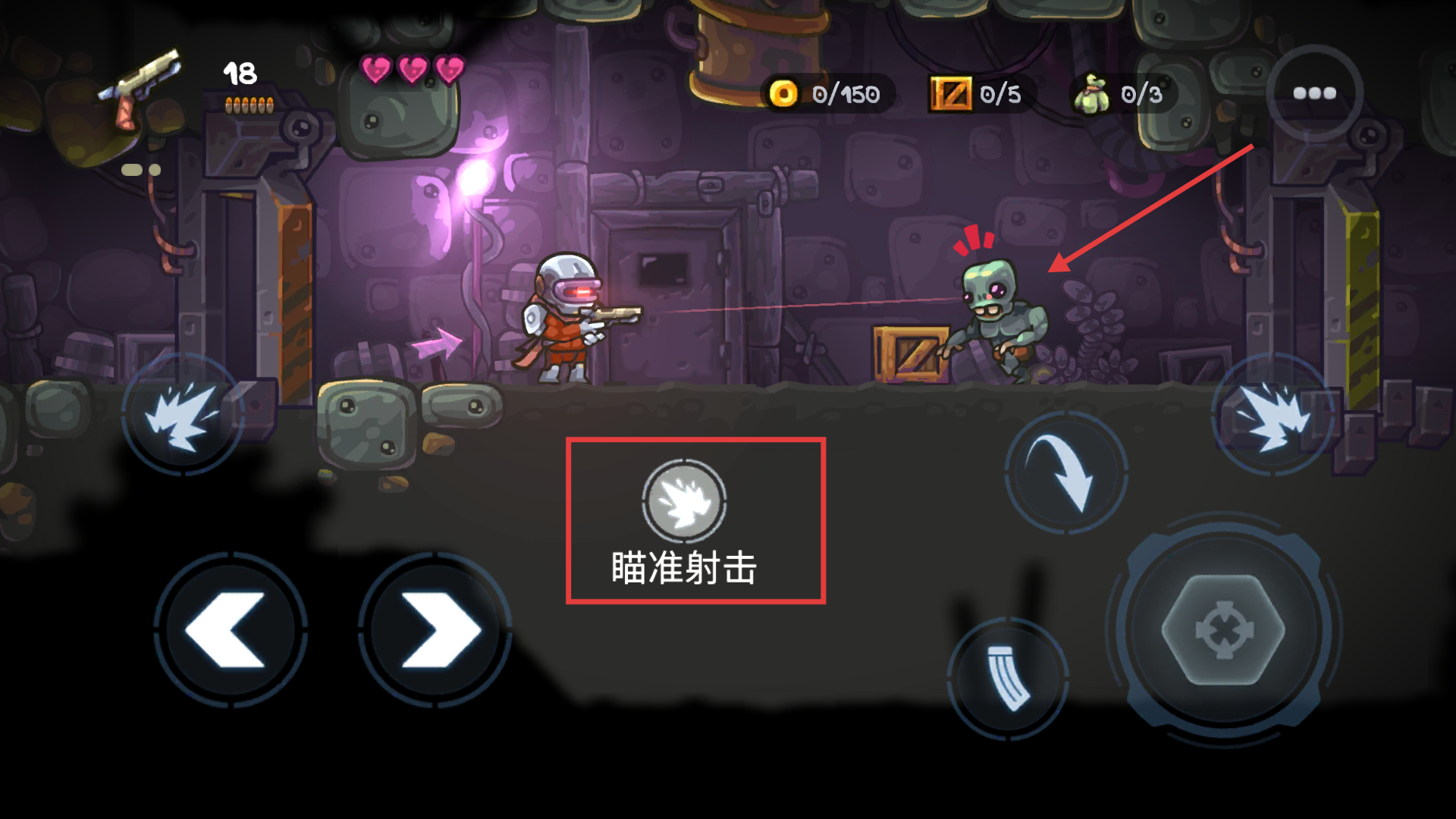 1、使用左侧摇杆控制移动,右侧瞄准攻击,点击跳跃箭头躲避危险,快速消灭出现的僵尸推进关卡。