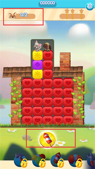 2、本关目标为解救2只宠物,初始进度0/2,场景中红色方块占比高,可使用底部的火箭道具快速消除大片方块。