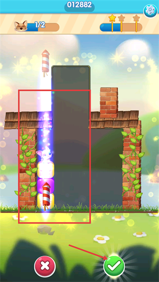 3、触发火箭道具后,大片方块被消除,当前已解救1/2只宠物,点击绿色对勾确认操作,继续推进宠物救援进度。