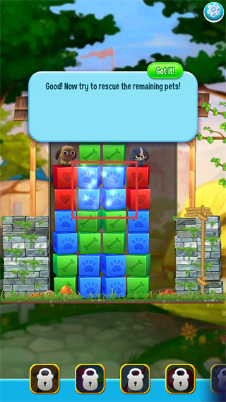 2、界面提示“解救剩余宠物”,点击【Gotit!】关闭提示,优先消除高亮的蓝色方块,推进宠物的移动路径。