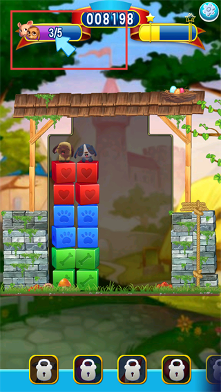 3、当前已解救3/5只宠物,积分达8198,持续消除宠物下方的红、蓝方块,同时积累积分向目标进度推进。