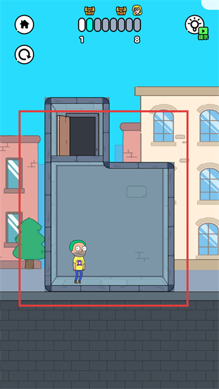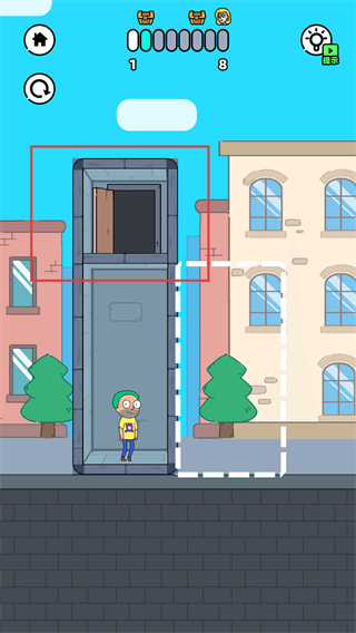 2、拖动电梯区域的白色虚线部分,调整电梯的空间布局,让角色与顶部电梯门的路径连通,推进通关进度。