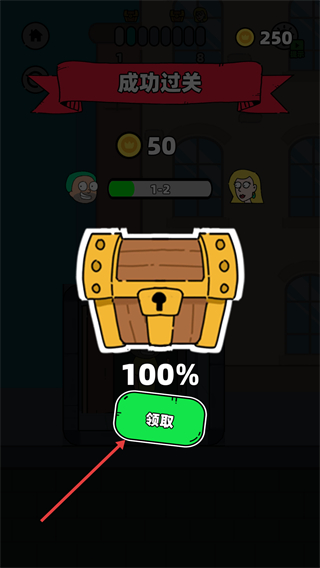 4、成功过关后获得50金币与100%进度宝箱,点击【领取】按钮获取奖励。
