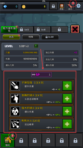 1、优先用【SP】升级【子弹加强-1】【准确的镜头】等技能,提升伤害和暴击几率,增强初期战斗能力。