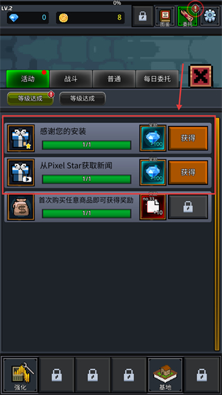 2、及时领取【感谢您的安装】【从PixelStar获取新闻】的奖励,快速积累【钻石】,为后续强化角色做准备。