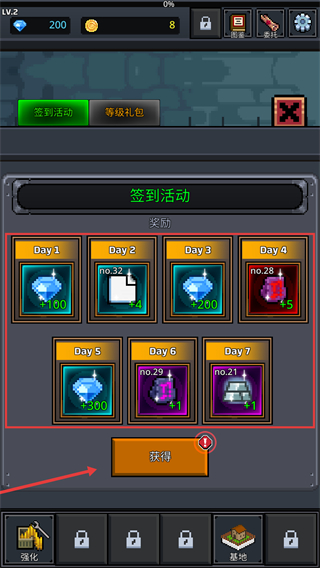 3、每日参与【签到活动】,领取【Day1】到【Day7】的钻石、道具奖励,持续提升资源储备。