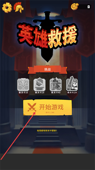 1、进入游戏主界面,点击【开始游戏】进入关卡,界面展示了不同挑战目标,核心玩法是通过移动机关保护宝箱。