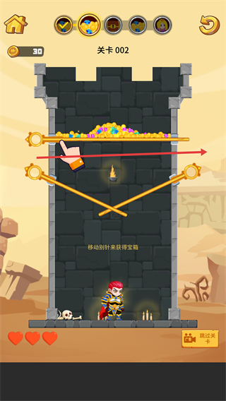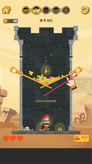 2、关卡002中,需移动金色时针机关,调整其角度形成防护区域,目标是让宝箱落入安全区域,避免掉落伤害。