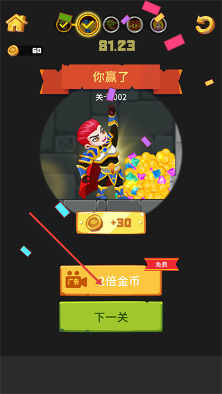 4、通关后获得+30金币奖励,可选择观看广告获取2倍金币,或点击【下一关】继续挑战,积累金币解锁更多关卡。