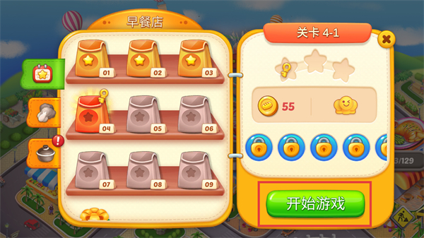 1、点击【开始游戏】按钮,开启该关卡的早餐经营挑战。
