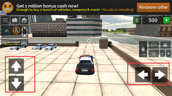 2、进入驾驶界面后,通过左侧上下键控制车辆前进后退,右侧左右键控制转向,先熟悉操作,将警车从停车场驶出,前往任务地点。