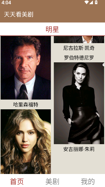1、进入首页查看影视明星相关信息,浏览各类美剧主演资料与出演作品。