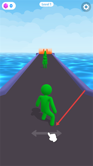 1、在Level1关卡中,通过滑动底部的左右按钮控制绿色小人移动,靠近前方的同类小人,集结队伍以提升闯关的人数基础。