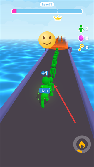 2、控制集结后的小人队伍继续前进,沿途集结更多同类小人,可提升自身等级,稳步推进关卡进度。