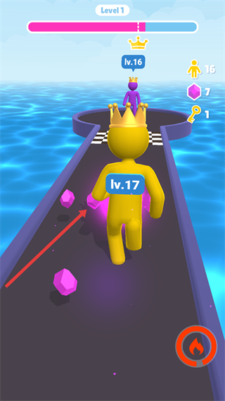 3、收集关卡沿途的粉色宝石获取道具奖励,提升小人等级至更高阶(如lv.17),向关卡终点的对战区域推进。