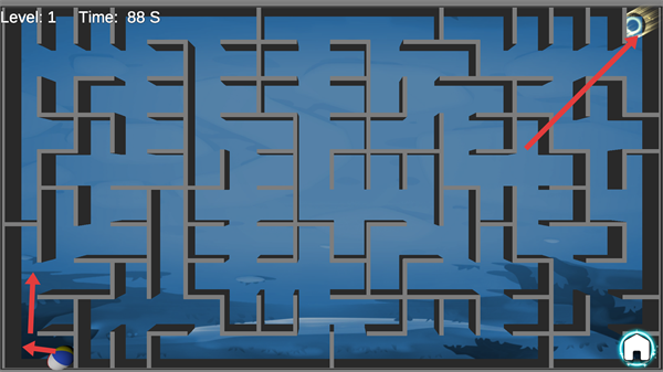 3、在第1关的迷宫场景中,控制小球沿箭头指引的路径移动,向迷宫的终点区域推进,尝试达成关卡通关目标。