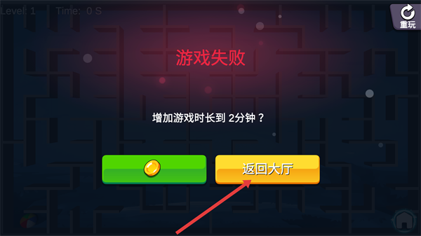 4、若出现游戏失败的情况,点击界面中的【返回大厅】按钮,回到重力迷宫主界面,可重新选择关卡发起挑战。