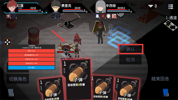 2、使用【子弹】卡牌攻击拦路怪物,每张【子弹】可让目标受到3-伤害,选中目标后点击【确认】即可触发效果。