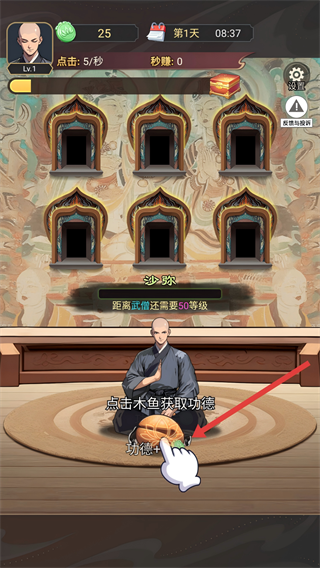 1、开局先点【木鱼】攒【功德】,当前是【沙弥】阶段,攒够功德就能升级哦。