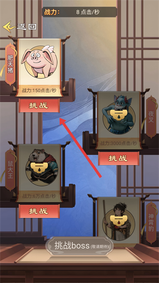 2、看【挑战界面】里【肥天猪】战力适配当前状态,点【挑战】按钮,打赢攒收益,再逐步挑战更强对手啦。