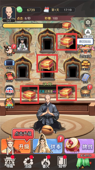 3、先领界面里的【宝箱】拿奖励,再用攒的功德点【升级】按钮,秒赚收益变高,效率一下提上来咯。
