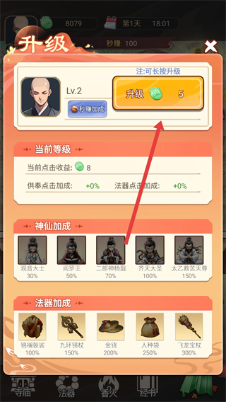 4、在升级界面长按【升级按钮】,叠加【秒赚加成】涨收益,后续结合【神仙加成】,能让修行进度再快上不少哦。
