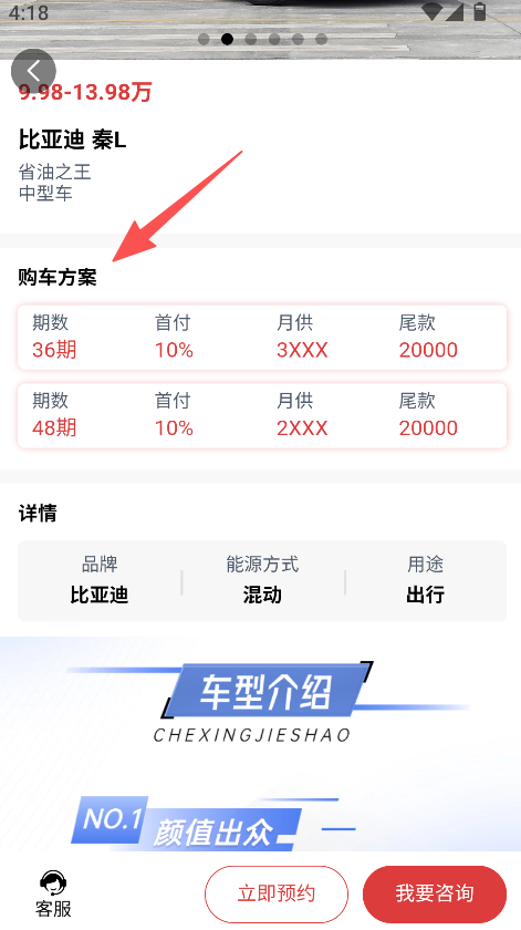 2、详情页提供多期数购车方案,清晰展示首付月供尾款,辅助规划购车资金。