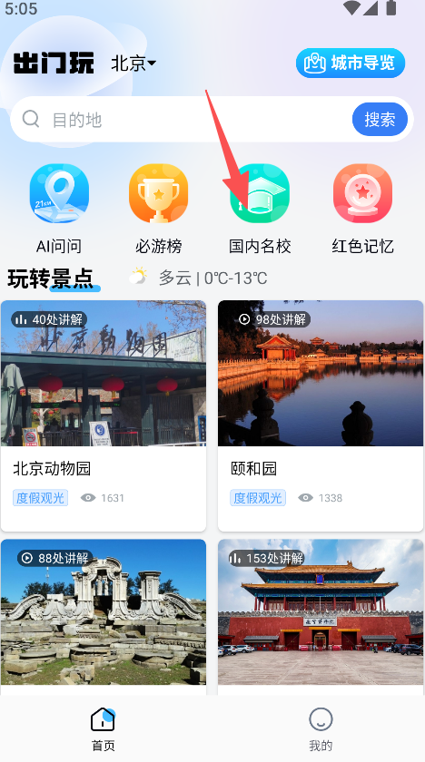 《出门玩》是一款旅游服务类软件,支持城市切换,设搜索栏查找目的地,含AI问问必游榜国内名校红色记忆等板块。展示景点及院校信息,标注讲解数量,国内名校板块呈现多所高校并搭配距离信息;玩转景点板块展示景区,标注讲解数与浏览量。AI问问板块提供旅行计划制定、目的地推荐、饮食搭配等服务,覆盖旅游信息查询、行程规划、出行建议等环节,满足不同旅游场景的信息获取与规划需求,简化旅行筹备流程,提升旅行规划效率。