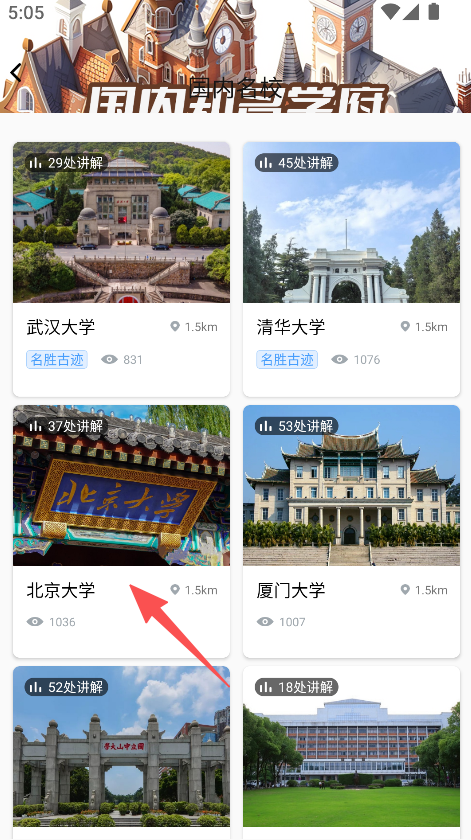 2、景点院校信息附带讲解数距离,核心信息直观呈现,助力快速了解内容。
