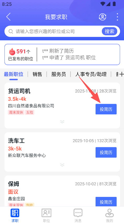 2、支持求职投递功能,进入求职页面选择目标职位,点击投简历按钮完成求职申请。