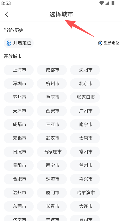 1、打开忆悦到家选择城市页面,选择目标城市。
