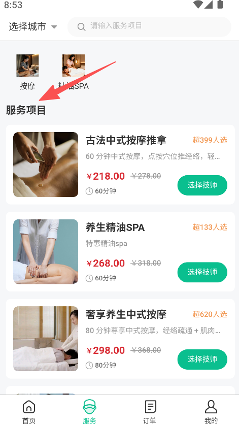 2、设服务项目板块,展示按摩SPA 等服务,标注时长价格,清晰呈现服务核心信息,助力快速了解内容。