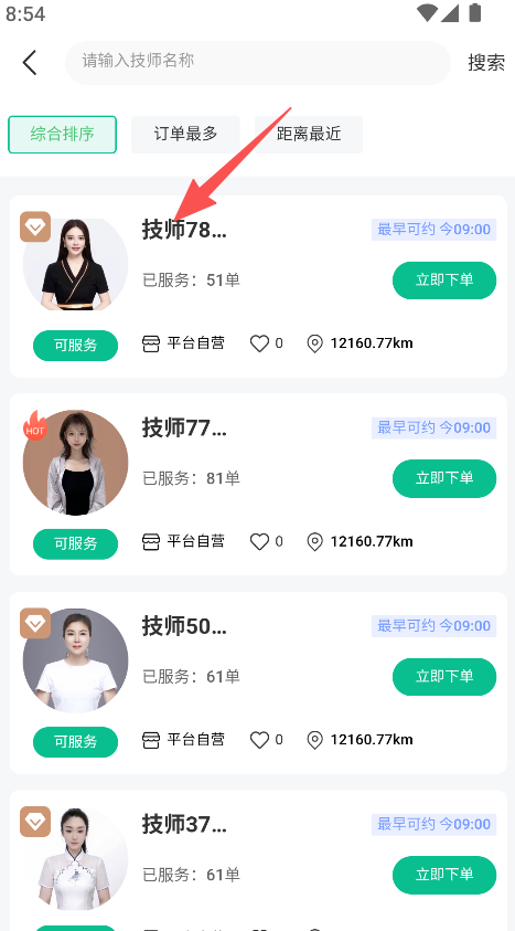 3、提供技师列表,展示服务单数及可预约时间,辅助选择经验匹配时间契合的服务人员,优化选择体验。