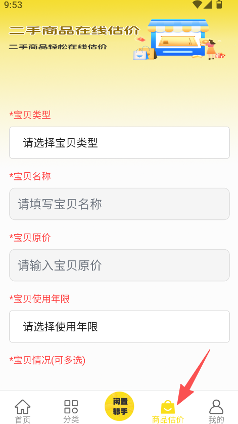 2、支持闲置商品估价功能,填写类型名称原价等信息,选择使用年限与宝贝情况,完成估价信息提交。