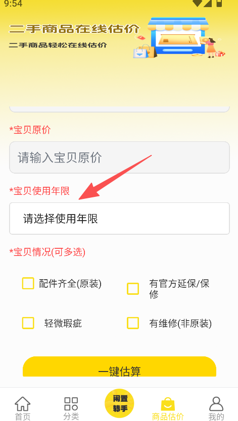 3、选择使用年限和宝贝情况,点击一键估算。