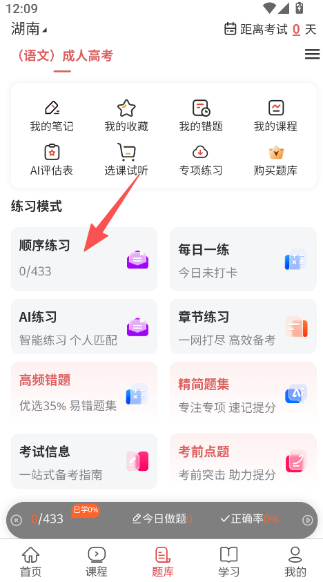 1、提供多类练习功能,选择顺序练习等模式,完成对应题目练习,推进成人高考备考进度。