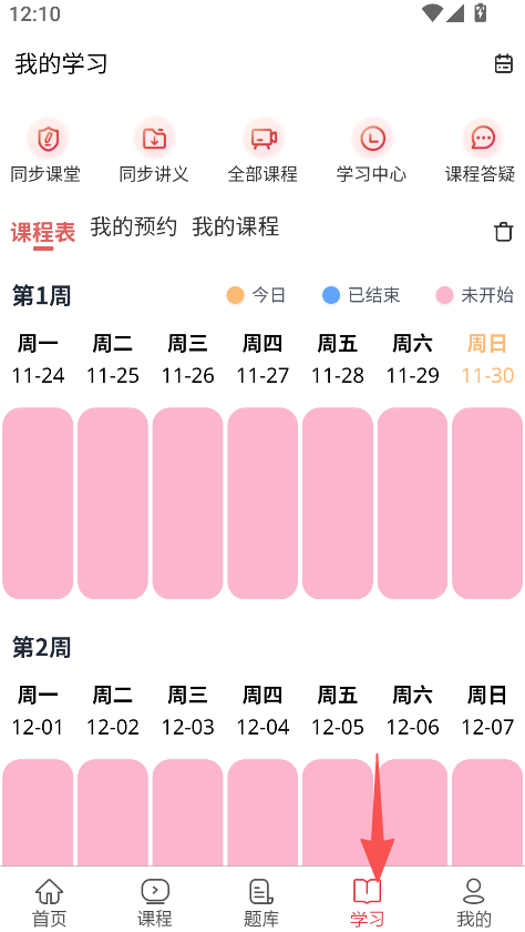 3、实现课程学习功能,进入学习板块查看课程表,参与同步课堂同步讲义学习,掌握知识点。