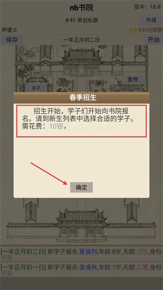 2、春季招生阶段系统提示需花费【10银】,点击【确定】按钮即可进入新生选择界面。